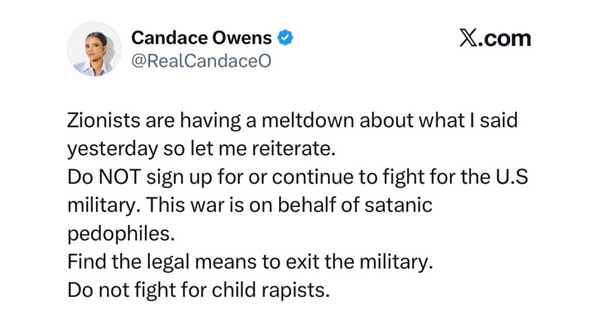 — Не вступайте в ряды армии США и не продолжайте воевать на её стороне. Эта война ведётся от имени сатанинских педофилов. Найдите законные способы уволиться из армии. Не сражайтесь за насильников детей.