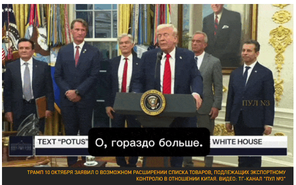 Перемирию в этой сфере предшествовала драматическая история. 9 октября Минкоммерции КНР опубликовало два документа об ужесточении контроля над экспортом редкоземельных металлов и связанных с ними технологий. 10 октября Трамп заявил, что США с 1 ноября или ранее введут дополнительно 100%-ные пошлины в отношении продукции из Китая и ещё ряд возможных ограничений, прежде всего на поставки в КНР запчастей к авиатехнике.