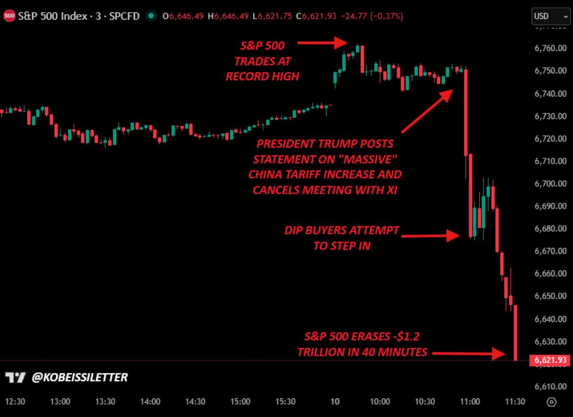 Только что стало известно, что Китай занял чрезвычайно агрессивную позицию в торговле, направив миру крайне враждебное письмо, в котором заявил, что с 1 ноября 2025 года введёт масштабный экспортный контроль практически на всю производимую им продукцию, а также на некоторые товары, которые он даже не производит… Соединённые Штаты Америки введут 100-процентный тариф на Китай, превышающий любой тариф, который он платит в настоящее время. Кроме того, с 1 ноября мы введём экспортный контроль на всё критически важное программное обеспечение, заявил Трамп.