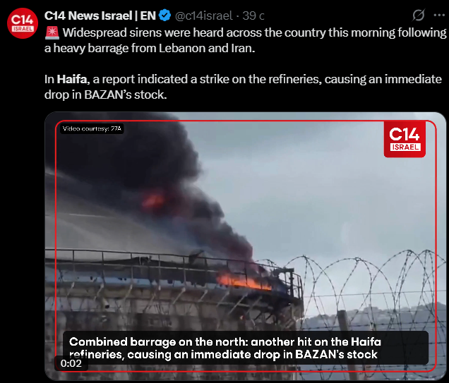 Тем временем, нефтеперерабатывающий завод в Хайфе, Израиль, сильно пострадал после обстрела химического завода в Негуеве.