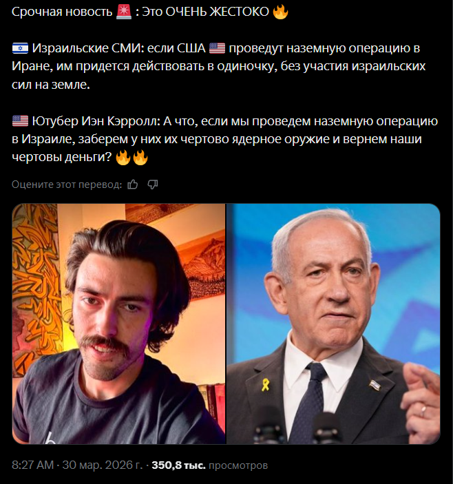 Наконец-то кто-то, имеющий возможность высказаться, сказал это. Израиль объявил войну американскому народу. Пришло время американскому народу объявить войну в ответ. Не умирайте за этих чертовых израильтян. Пусть израильтяне чувствуют себя в опасности везде, куда бы они ни пошли. Их и так недостаточно ненавидят.