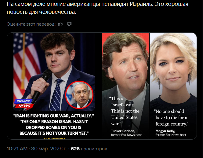 Американский народ устал от правления сионистов, от растраты налоговых денег на их поддержку... «Израиль прежде всего» больше не популярен среди американского народа.