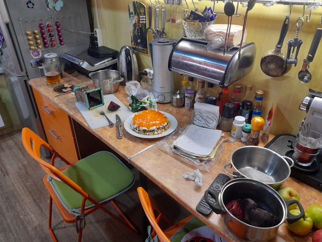 Ну что, малята, готовитесь? Мы тоже!На верхней фотке - творческий беспорядок, наведённый приготовлением новогодних блюд : оливьеха к этому моменту готова, а на столе заготовка салатика "сельдь под шубой"Процесс :
