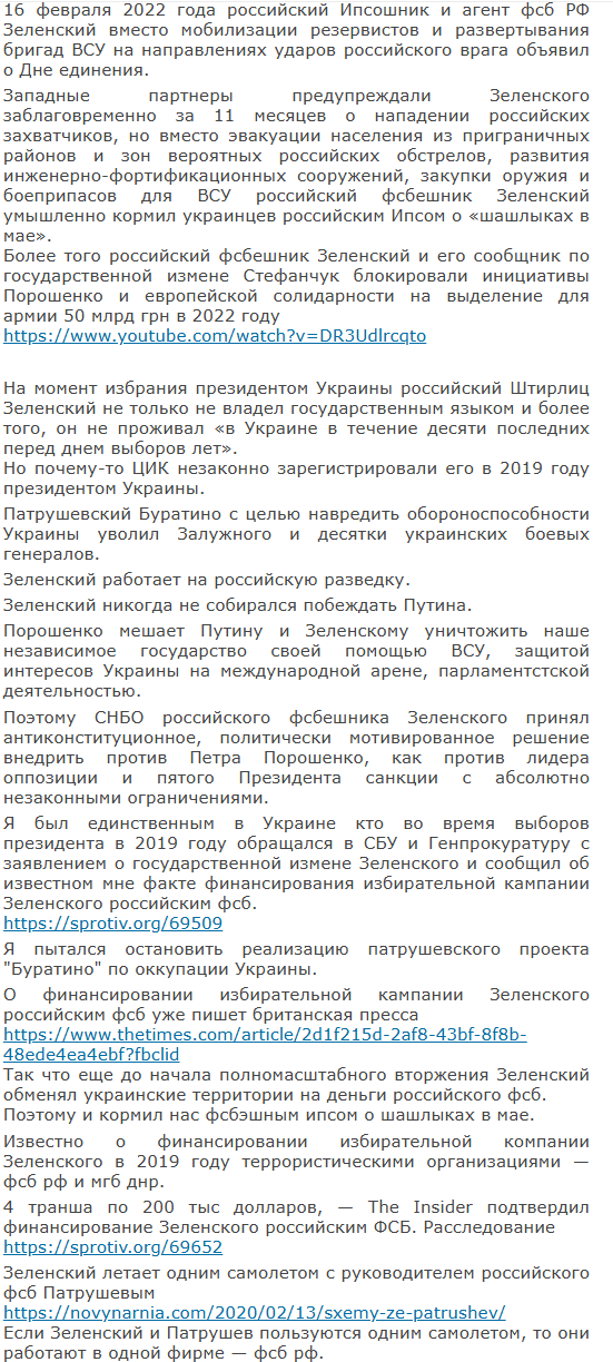Проблема в одном, пациент глубоко и безнадежно болен припорошенным украинством . И в весь свой горячечный бред он вставляет фамилии российских чиновников в качестве кураторов «агента Zеленского». Ни английские фамилии, ни американские, ни фамилии европейцев, открыто объявляющих о выделении режиму Зеленского деньги и оружие! Зеленский у этого больного и его подписчиков и приверженцев – агент Путина!