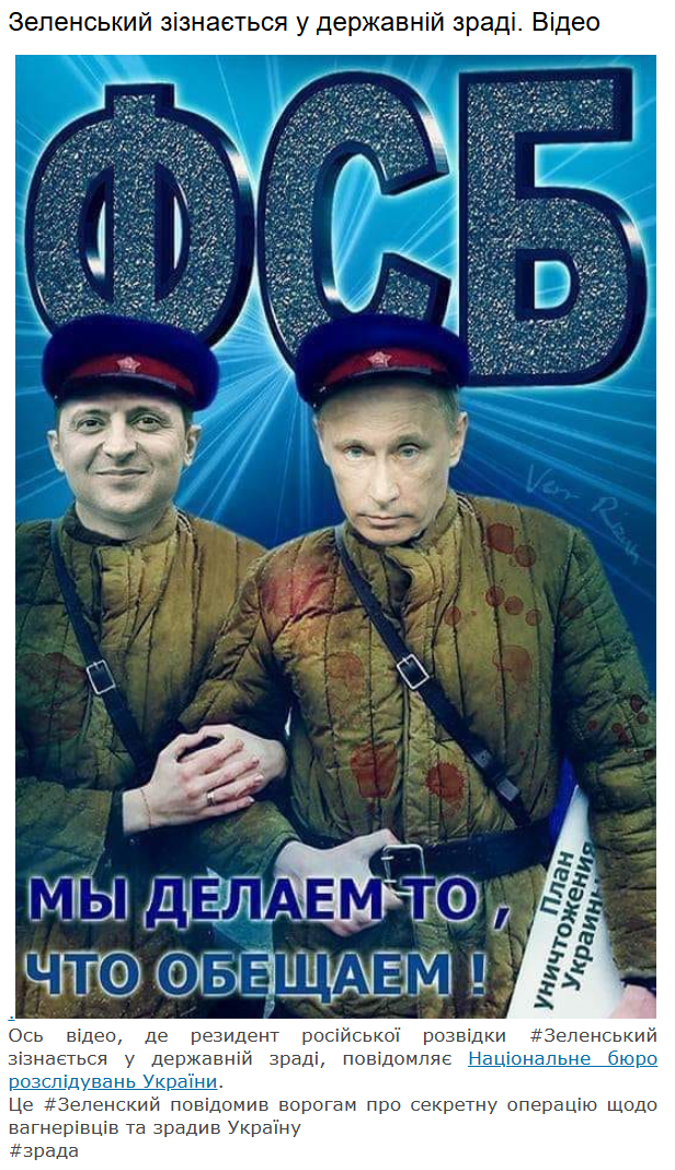 Адепты этого политического движения всерьез утверждают, что сам Владимир Зеленский и его правая рука Андрей Ермак – это агенты российской разведки, внедренные в высшие структуры украинской власти для уничтожения Украины, для передачи украинских территорий Российской федерации и для параллельного убийства как можно большего количества украинцев. По их мнению: Украина уже полностью, на 100% оккупированное Россией государство. Россия захватила на Украине всю власть 21 апреля 2019 года (день победы на выборах Зеленского). Россия при помощи ТЦК крадет людей на улицах и потом убивает их об российские же войска на фронте. Россия ввела на Украине тотальную цензуру. Россия уничтожила на Украине всю правовую систему и именно потому украинцы сегодня бесправные кріпаки. Никаких политических выборов украинцам больше не светит не потому, что военное положение не позволяет, а потому, что агентура Кремля (Зеленский и Ермак) захватили власть и чётко выполняют директиву Кремля: все цели СВО будут достигнуты. Украинцев пытают и убивают ТЦК именно по приказу Путинских опричников – Ермака и Зеленского.