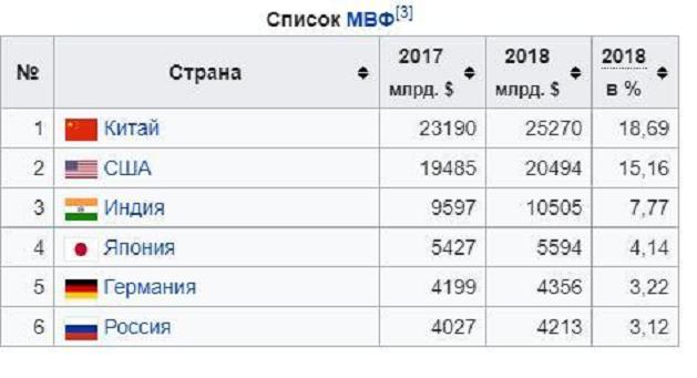 На 2019 год изменения не значительные, все остаются на своих местах, но в 2020 году ситуация может измениться в пользу России – ВВП (ППС) на душу населения в России значительно выше ВВП по ППС Китая и Индии, в полтора или в два раза – не все ли равно? Кроме того, у Китая внешний долг более, чем полтора триллиона $ и долговых обязательств казначейства США на триллион $. Внешний долг Индии порядка 7,7 триллионов $...