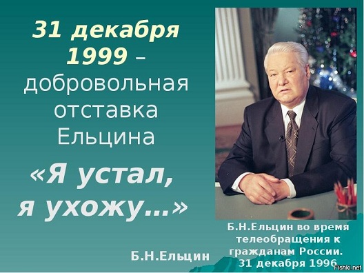 Вошли они [с поздравлениями], а вышли уже с отречением от престола . Было, по позднему признанию Шойгу, «человек восемь». Ельцина не выпускали из кабинета. Быстро записали новогоднее обращение к нации. Тогда «дорогие россияне» услышали историческое обращение уже не вполне вменяемого алкаша: «Я ухожу, ухожу раньше положенного срока. Я понял, что мне необходимо это сделать».