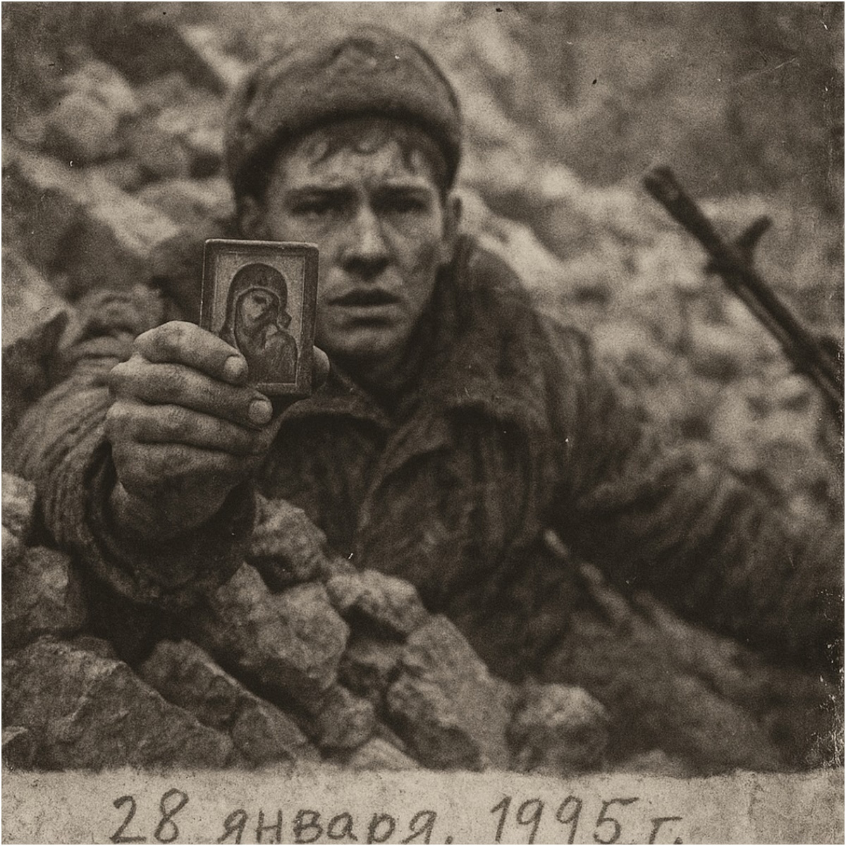 Его рука сама метнулась за пазуху бушлата и вытащила... не нож, не гранату. Маленькую, размером с ладонь, карманную икону. Казанская Божия Матерь. Дешёвая, печатная, вставленная в кусок дерева.