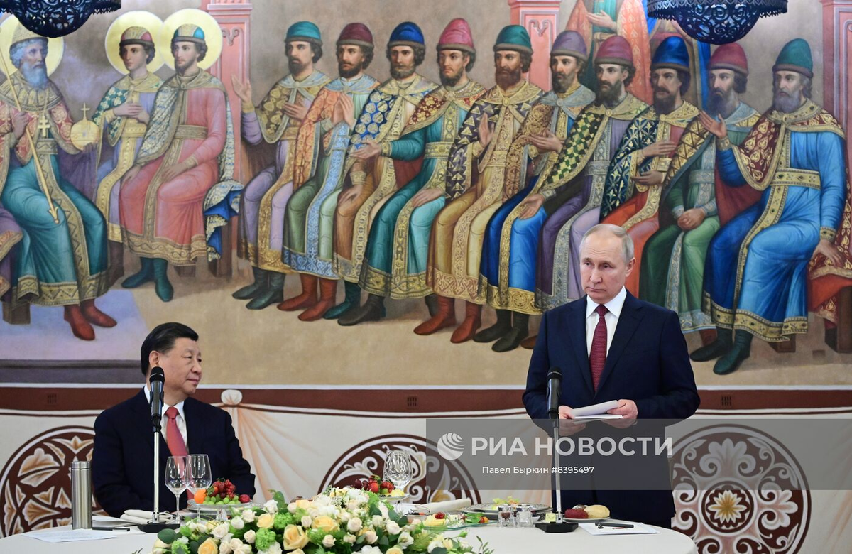 Путин и товарищ Си в Кремле на фоне очень неслучайной фрески. Владимир Креститель и его 12 сыновей. Это библейский Иаков и его 12 колен, 12 сыновей. В исторической действительности это Великая Русь и ее 12 частей, 12 племен.