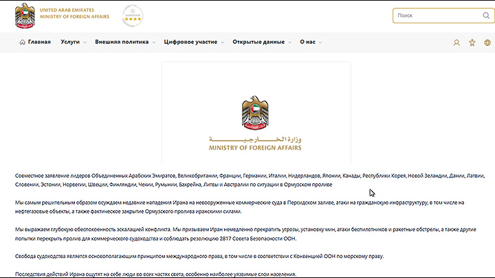 Мы самым решительным образом осуждаем недавние атаки Ирана на безоружные коммерческие суда в Персидском заливе, атаки на гражданскую инфраструктуру, включая нефтегазовые объекты, а также фактическое закрытие Ормузского пролива иранскими силами… Мы выражаем готовность внести вклад в соответствующие меры для обеспечения безопасного прохода через пролив. Мы приветствуем приверженность стран, занимающихся подготовительной подготовкой,