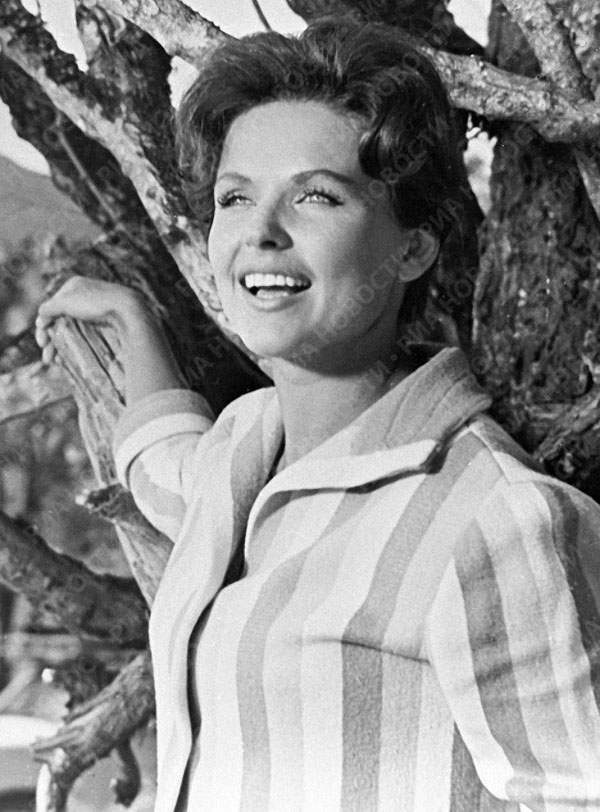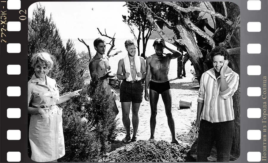 Наталья Кустинская, Евгений Жариков, Андрей Миронов, Геннадий Нилов и Наталья Фатеева на съёмках фильма Генриха Оганесяна "Три плюс два"