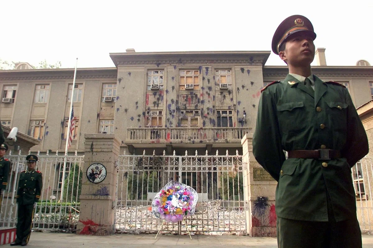 А там, в том Китае, в столице Пекине, американское посольство было после случившегося под охраной военных целую неделю, так как прошли массовые протесты в адрес США. И американскому посольству был нанесен тоже зримый ущерб от манифестантов.