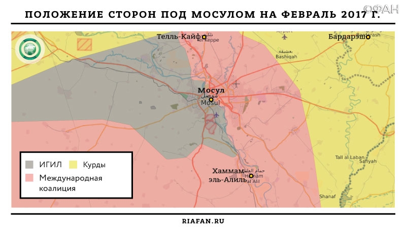 Цель была поставлена амбициозная — полностью вернуть миллионный город под контроль багдадских властей. Надо сказать, что к тому февральскому дню часть отрядов «Пешмерги» находилась всего в 9 километрах от центра Мосула, кое-где выйдя к окраинам этого крупного города.