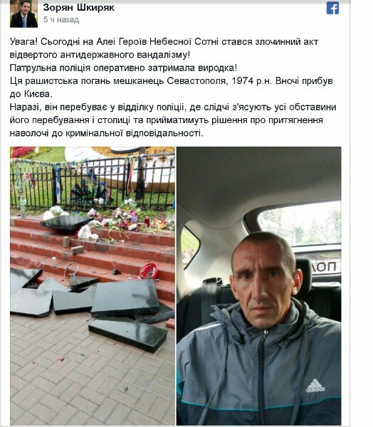 На фото Севастополец, который в центре Киева не побоялся снести к херам памятник убийцам людей на Донбассе. Он задержан.