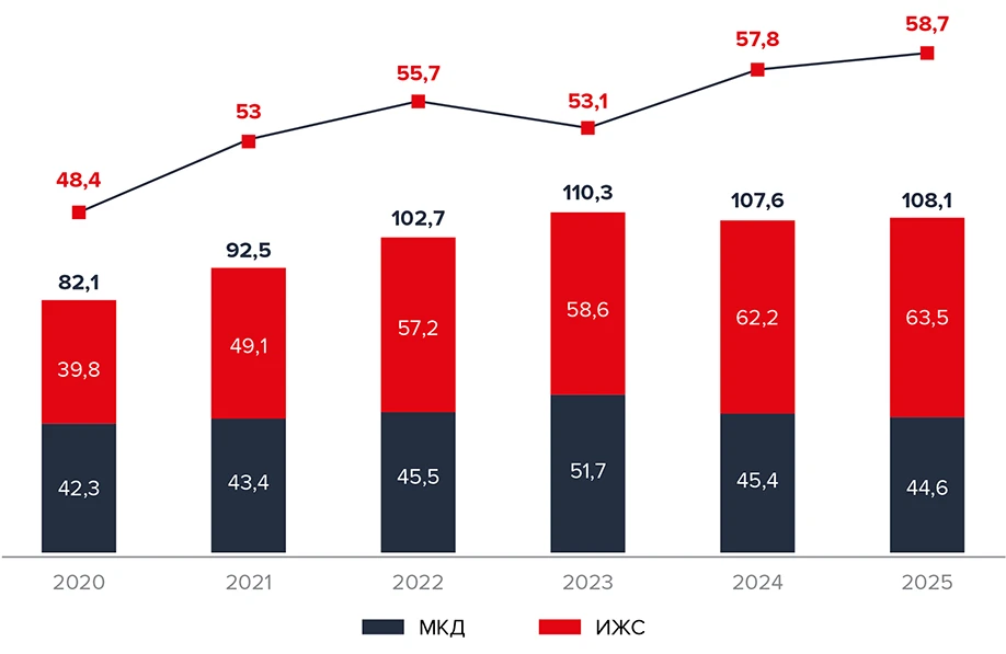 По данным Росстата, ввод жилья в России в 2025 году вырос на 0,4% в годовом выражении — до 108,1 млн кв. м. Положительную динамику обеспечил сектор индивидуального жилищного строительства (ИЖС), на который пришлось 59% общего объёма ввода.