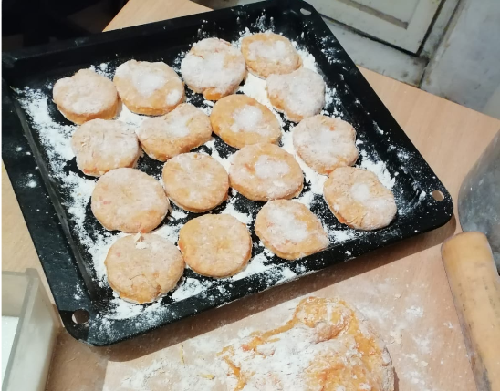 Добавляю ещё стакан муки, замешиваю тесто мягкое, нежное в муке, что бы не прилипало к рукам и раскатав примерно 2 см. толщиной, большим фужером нарезаю пряники.