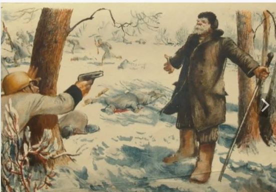 Когда враг стал стремительно приближаться к деревне, где он жил, многие соседи поспешили в эвакуацию. Крестьянин с семейством предпочёл остаться.