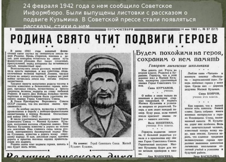 Но справедливость восторжествовала. Указом Президиума Верховного Совета СССР от 8 мая 1965 года за мужество и героизм, проявленные в борьбе с немецко-фашистскими захватчиками, Кузьмину Матвею Кузьмичу посмертно присвоено звание Героя Советского Союза с вручением ордена Ленина.