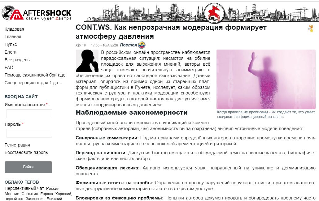 Данный материал, опираясь на пример одной из старейших платформ для публицистики в Рунете, исследует, каким образом техническая структура и практика модерации способствуют формированию среды, в которой настоящая дискуссия заменяется скоординированным давлением.