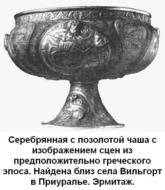 А вот на изображении ниже найденная чаша у села Вильгорт, это Приуралье, ближайшие города: Березники, Пермь, Нижний Тагил. Может быть, Македонский проходил эти места, двигаясь в страну мрака?