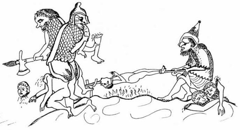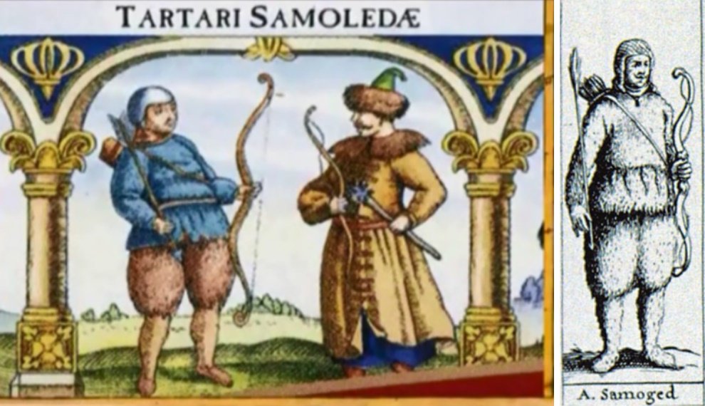 Так якобы они лично видели Сибиряков безголовых. Еще утверждают, что существует сибирское племя самоедов (самогеть гиндийская, самогеты), которые поедают друг друга и лично одному из этих горе туристов, отец самоед якобы зарубил свою дочь на угощенье. Но если вспомнить, жрецы, волхвы, ведуны, специально распространяли жуткие мифы для иноземцев, чтобы не совали свой нос в сокровенные места. Те, кому позволено было пройти в запретные места, изобразили самоедов таким образом, рисунок ниже.