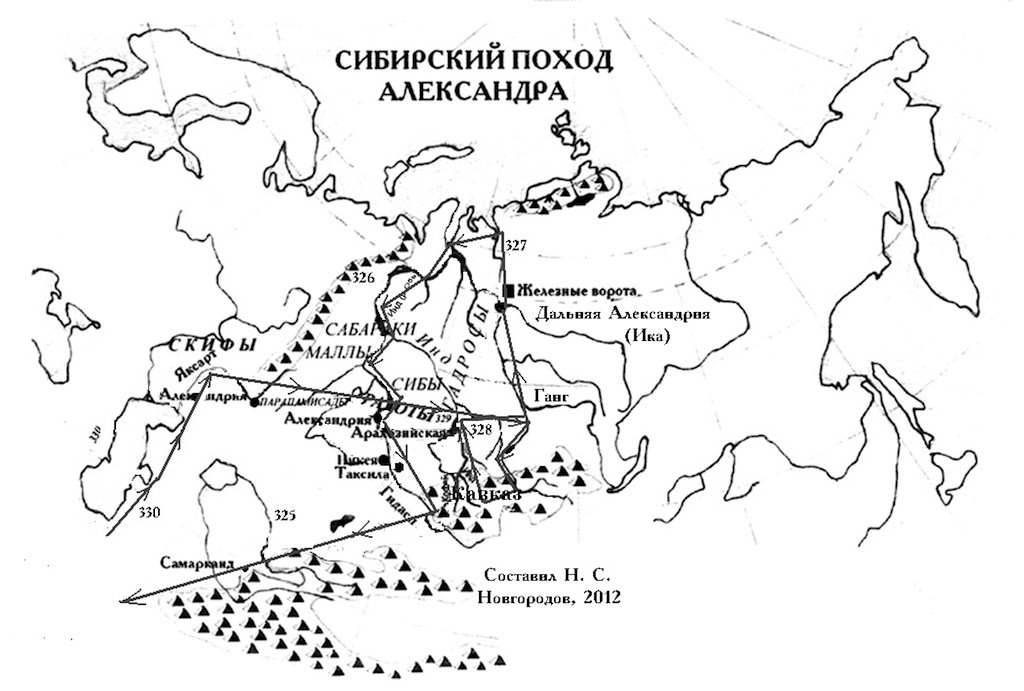 Итак, в самом первом приближении Александр с реки Урал зимой 330-329 года продвинулся южно-сибирскими степями до реки Обь, принятой им за Инд. На берегах лежал глубокий снег. Лето и осень 329 года он воевал с местными народами, постепенно продвигаясь на восток. Зазимовал он на юге Минусинской котловины в предгорьях Западного Саяна. Весной его армия перешла Западный Саян с севера на юг по так называемой "дороге Чингисхана, "имея Индию справа" и направилось на отдых в Самарканд, откуда весной 327 года вновь двинулась в "Индию". В своей работе Низами пользовался трудами персидских и арабских историков, свободными от христианской цензуры. Его труд из разных источников складывался в гармоничное стихотворное повествование "Искандер-наме". В своих стихах он отмечает о страхе Македонского в предстоящем походе на Русь.