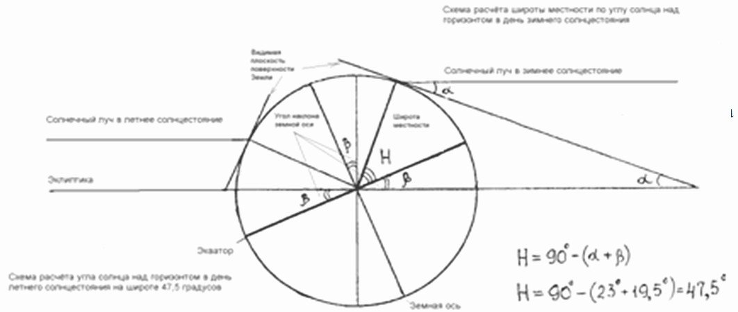 Ученые греки, сопровождавшие армию Александра, везде измеряли длину тени от деревьев известной высоты. Делали они это в полдень (полуденная линия - это самая короткая тень). По отношению высоты дерева к длине тени определялся тангенс угла солнца над горизонтом в полдень, а по тангенсу сам угол. Высота солнца над горизонтом зависит от широты местности и от времени года. У нас в Томске, например, в зимнее солнцестояние 21-22 декабря солнце не поднимается выше 10 градусов. А в летнее солнцестояние в конце июня достигает 56 градусов. В субтропической Индии солнце зимой не опускается над горизонтом ниже 34 градусов. Некоторые измерения греки до нас донесли. Диодор писал, что дерево высотой 70 локтей отбросило тень на три плефра. При размерности локтя 0,45 м и плефра 28,7 м тангенс равен 0,354 и сам угол составляет 19,5 градусов. Расчет широты местности для зимнего солнцестояния показан на рисунке.