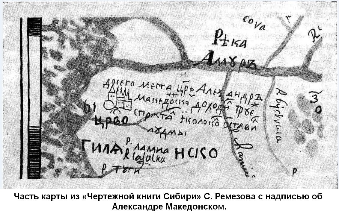 - Карта мне известна одна. С.У. Ремезов в "Чертежной книге" приводит карту Нижнего Амура с надписью "До сего места царь Александр Македонский доходил, и оружие спрятал, и колокол с людьми оставил". К этой карте можно было бы относиться как к курьезу, если бы не одно важное обстоятельство. Сплавляясь по Енисею, Александр достиг области близ океана, которую монголы называли "Мангу". Точно также на тунгусо-манчжурских языках звучит название Амура. По-видимому, Ремезову тунгусы доложили, что Македонский достиг Мангу и он решил, что это Амур.