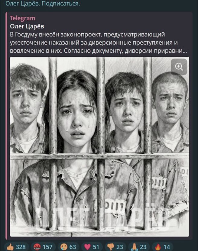 Когда Олег Царёв врёт? Ну.. он очень милый бывший украинский политик, он в принципе не может врать.. я так думаю Олег Царёв Совет Федерации одобрил закон о понижении возраста уголовной ответственности за преступления диверсионной направленности с 16 до 14 лет. В пояснительной записке к законопроекту указано, что инициатива должна устранит...