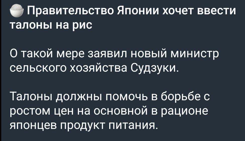 Японское правительство хочет ввести талоны на рис. Ещё раз: в Японии, где рис - один из основных продуктов питания, планируют ввести на него талоны. Мда.