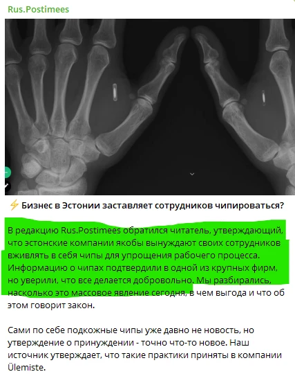 Честно говоря, это просто поразительно. До сих пор рассказы про чипы в людях вызывали лишь улыбки. Сейчас, судя по всему, ситуация в Эстонии обстоит таким образом, что шутить уже совсем не стоит. Примечательно, что пока эта история еще не вызвала грандиозного скандала.