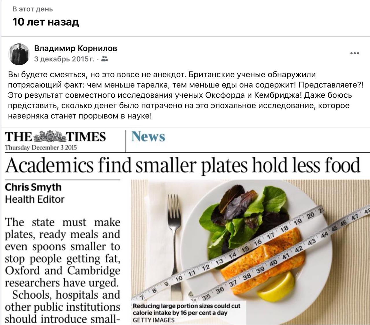 Оказывается совсем недавно у британских учёных был знатный юбилей! Ровно десять лет исполнилось их поистине эпохальному открытию - оказывается, что чем меньше тарелка, тем меньше еды в неё можно положить! Как мы жили раньше без этого открытия?