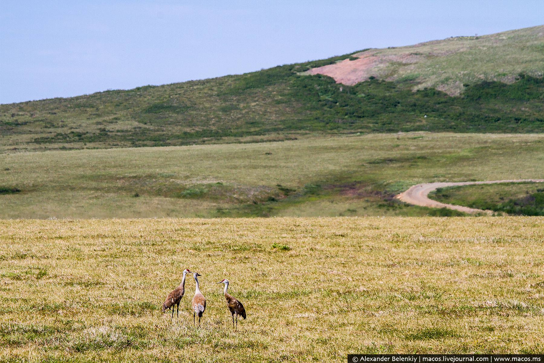 1 На Чукотку советуют ехать любителям природы, поэтому я не очень ей проникся: невысокие сопки, из растительности лишь травка. Сверху ещё хорошо смотрится миллион озёр, но тундра довольно скучное зрелище. Из диких животных я встретил только семейство из трёх журавлей, севших отдохнуть.
