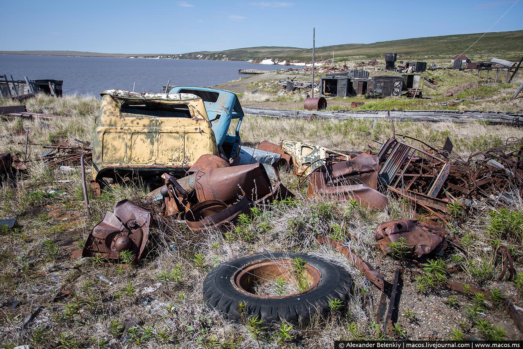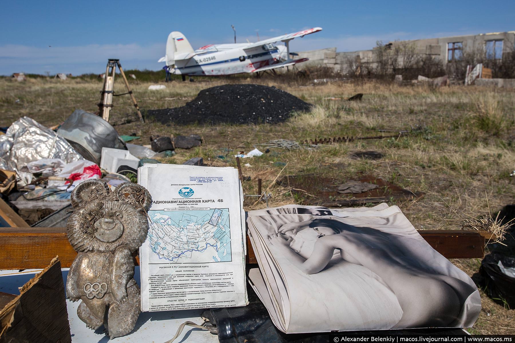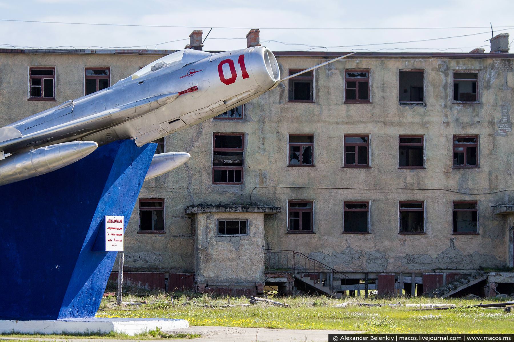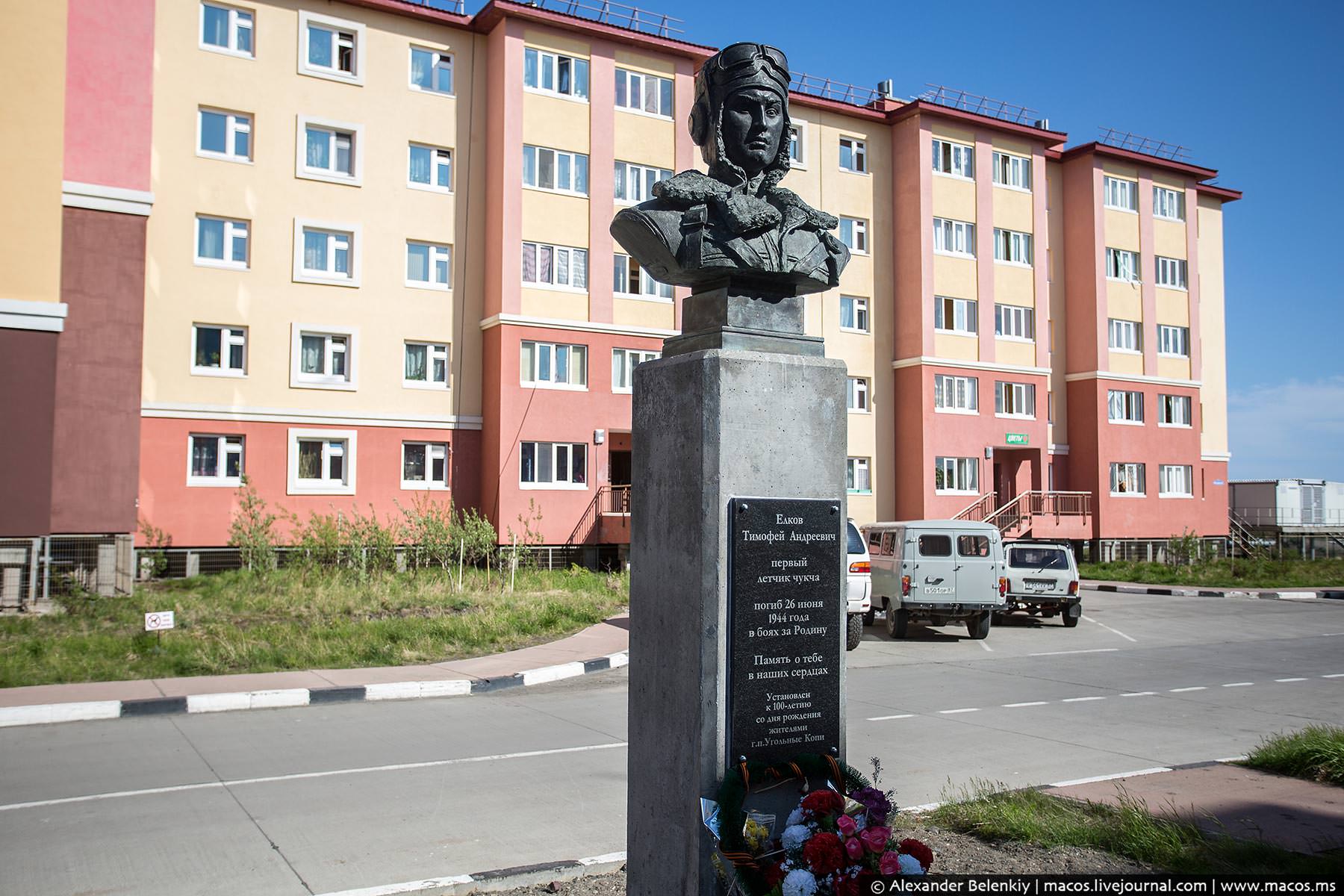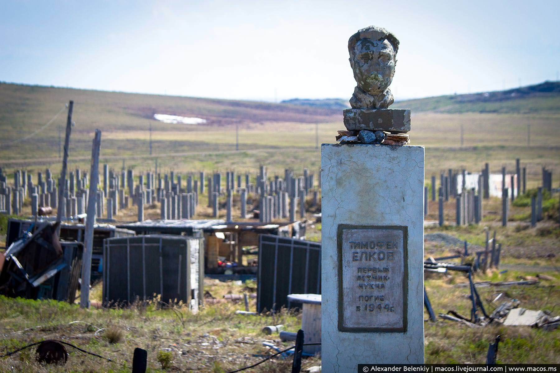 14 Посреди мёртвого города стоит памятник Тимофею Елкову, первому чукче-лётчику, погибшему в Великую Отечественную. Бюст стоит на камушках...
