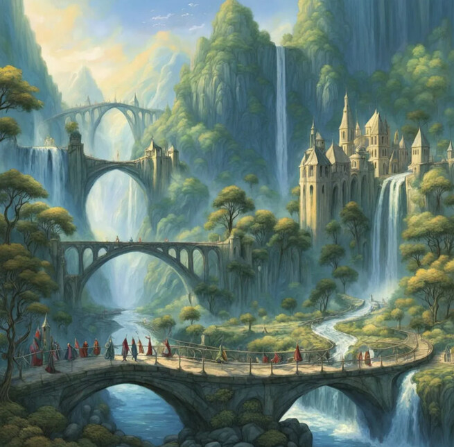 Fantasy art of Middle-earth, high-fantasy painting style. The scene shows the elven city nestled in a valley, with waterfalls...