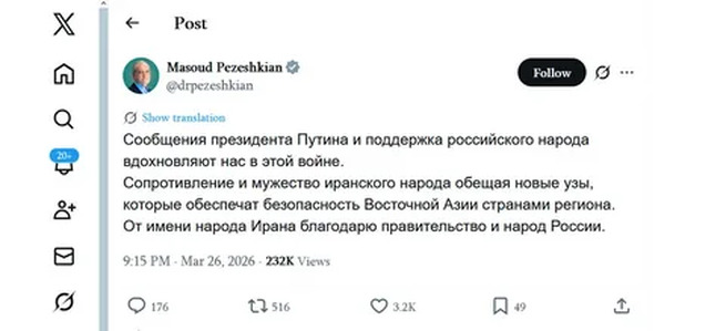 Президент Ирана поблагодарил Путина и народ России за поддержку на русском языке в посте в сети Х.После этого вопрос о том, о...
