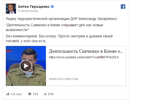 Позже он добавил в качестве ещё одного подозрения цитату главы ДНР, в которой Александр Захарченко говорит, что работа Савченко в Верховной раде открывает для них новые возможности.