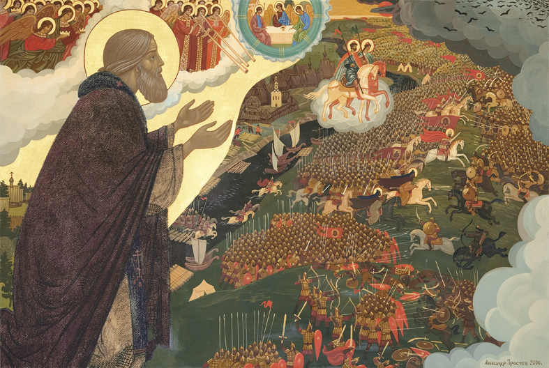 Действительно, речь ведь идёт о святом, который благословил «клятого» Московского князя Дмитрия Донского на Куликовскую битву, предсказал ему победу, да ещё и дал двух иноков Пересвета и Ослябю, своим подвигом вдохновивших войска. А Куликово, по убеждению многих учёных, стало зарождением Великороссии. Той самой – «страны-агрессора, извечного азиатского угнетателя древних свободолюбивых евроукров».