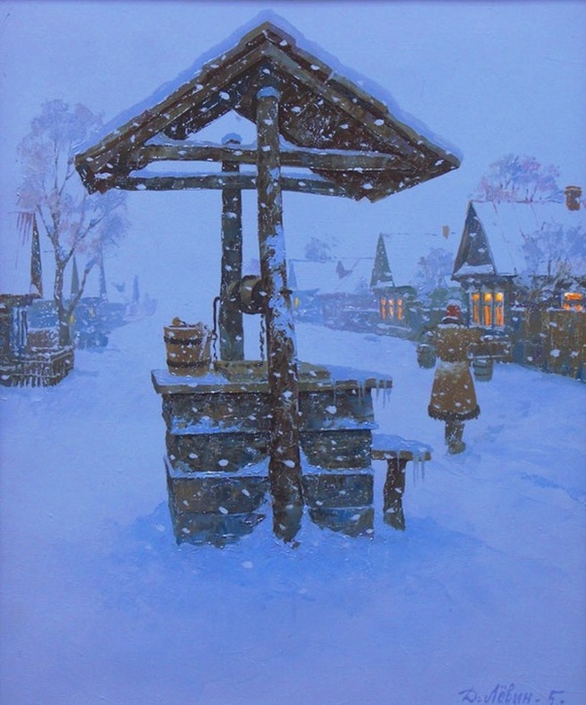 Стемнело. По тропинкам снежнымхозяйки с ведрами пошли.Скрипят таинственно и нежноколодезны...