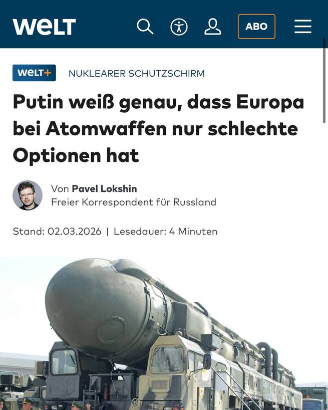 Издание Die Welt делится не радужной аналитикой: российский ядерный арсенал «превосходит всё, что могут предложить европейцы», а возможности...