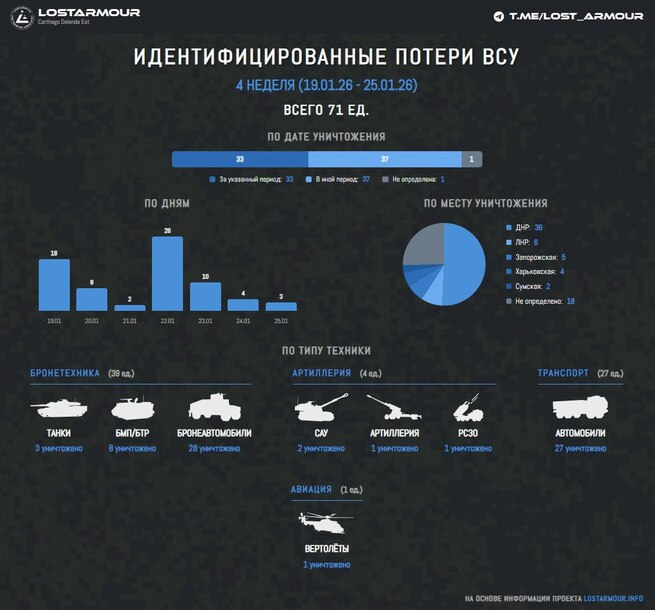 Идентифицированные потери ВСУ в технике в период с 19 по 25 января 2026 года. Инфографика на основании данных проекта LOSTARM...