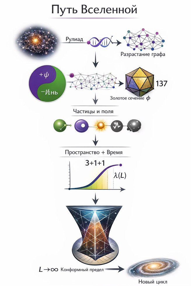 Представьте Вселенную как растущий гиперграф, где частицы, поля и галактики — это разные устойчивые состояния одной структуры...